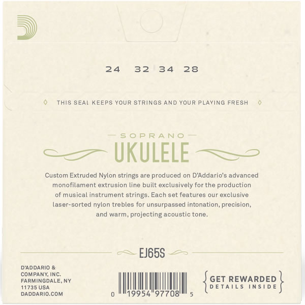 EJ65S is a string set for soprano ukulele, utilizing Pro-Arté Nylon trebles. Pro-Arté Custom Extruded Nylon sets the standard in terms of ukulele tone, intonation, and dynamic response.