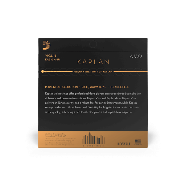 Take your sound from neutral to nuanced with Kaplan Amo violin strings. Kaplan Amo offers bold, warm tone, with a flexible response that’s welcoming to most players. Coupled with their quick break-in period and enhanced projection, Kaplan Amo strings provide a professional level of performance, which allows violinists to easily convey their instrument’s rich tonal palette. Kaplan strings are available in a range of sizes to suit most advancing players.