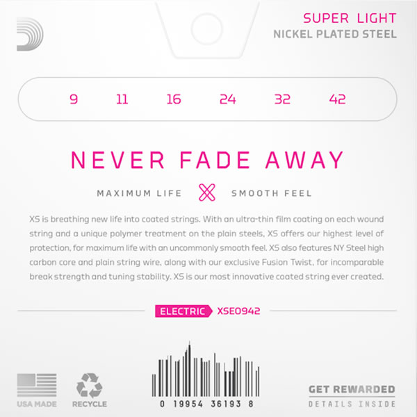 XS Nickel coated electric guitar strings provide the longest life of any D’Addario electric guitar string. Coated with our groundbreaking XS coating, these premium electric strings attain maximum life and a smooth, fast feel without dampening their outstanding tone. Constructed with a NY Steel core, reformulated nickel-plated steel wrap wire, and Fusion Twist technology, XS Nickel strings boast superior strength and tuning stability, plus richer harmonics, greater clarity, and remarkable definition with every sweep, slide, and bend. This 9-42 Super Light gauge set is easy to bend and very flexible.