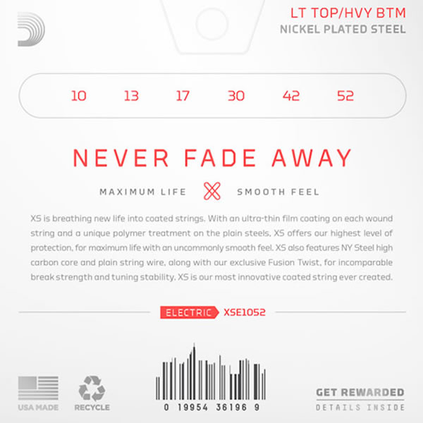 XS Nickel coated electric guitar strings provide the longest life of any D’Addario electric guitar string. Coated with our groundbreaking XS coating, these premium electric strings attain maximum life and a smooth, fast feel without dampening their outstanding tone. Constructed with a NY Steel core, reformulated nickel-plated steel wrap wire, and Fusion Twist technology, XS Nickel strings boast superior strength and tuning stability, plus richer harmonics, greater clarity, and remarkable definition with every sweep, slide, and bend. This 10-52 Light Top/Heavy Bottom gauge set has a deeper low-end than Regular Lights, balanced with comfortable playability.