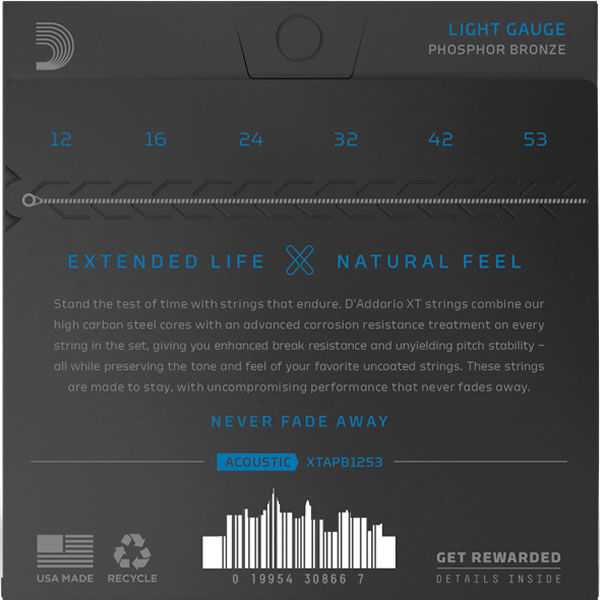 Since D’Addario introduced Phosphor Bronze acoustic guitar strings in 1974, they’ve been synonymous with warm, well-balanced tone. XT Phosphor Bronze offers that and more, boasting enhanced break resistance, better pitch stability, and longer life than our standard phosphor bronze strings. The XT coating delivers advanced corrosion resistance, while still retaining the warm tone and natural feel of the uncoated string. Beneath the coating, these XT acoustic strings are constructed with a NY Steel core, phosphor bronze wrap wire, and Fusion Twist technology, affording tonal versatility with added resilience, excellent for a wide range of acoustic styles. This 12-53 Light gauge set is our most popular acoustic gauge, providing a nice balance of playability and tone.