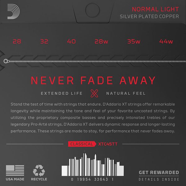 XT are our longest lasting classical strings, combining centuries of D’Addario expertise with modern coating technology. The Dynacore bass strings in this XT set use a revolutionary multi-filament nylon core processing technique to deliver unparalleled intonation, responsive attack, and crystal-clear projection—and with addition of our proprietary XT coating, a significantly extended lifespan. Coupled with our precision Titanium trebles, supplying distinct balance and increased resonance, XT Dynacore is the most advanced classical string available. This Normal Tension set is our best-selling tension, preferred for its balance of rich tone, comfortable feel, and dynamic projection.