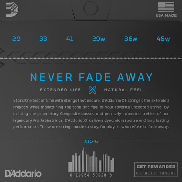 XT are our longest lasting classical strings, combining centuries of D’Addario expertise with modern coating technology. XT Classical features our composite basses, constructed with a long-lasting multifilament core, wrapped with silver-plated copper, and finished with our proprietary XT coating, for bold, projecting tone and extended life span. They’re complimented with our precision Pro-Arté nylon treble strings which provide the warm, mellow charm traditionalists love. This Hard tension set affords rich tone and strong projection.
