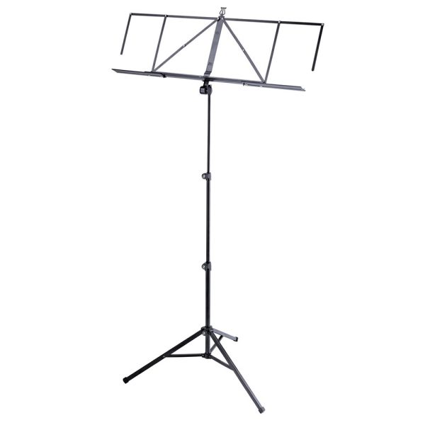 This music stand is equipped with an expandable music desk. Both music rests can be expanded to the right and the left and together with the additional sheet music holder provide for the viewing of 4 DIN A4 sheets of music next to each other. The comfortable angle is facilitated through very fine zinc-die-cast teeth. The expandable music desk collapses to a small and easy to transport size.