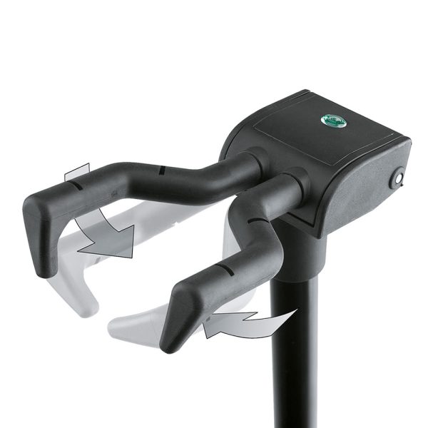 Folding stand for all guitars. Features a patented flexible hooking-in and clamping system which quickly and firmly grasps the guitar neck. Fits most instrument necks. Studs at support arms provide extra protection. Height adjustment with convenient locking levers. Anti-twist feature on the extension rod for extra safety. High quality non-marring rubber on the stand’s neck grip and base helps to protect the instrument. Stable robust base.