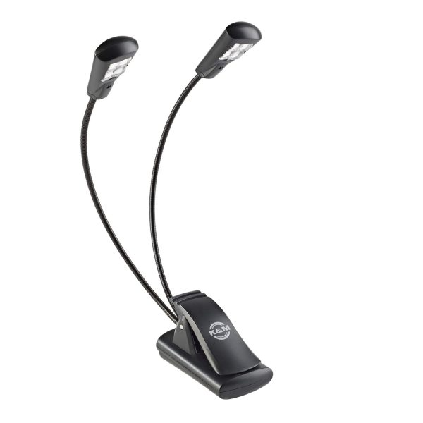 Powerful and multifunctional dual-headed light with 2 flexible goosenecks which allow the musician to focus light to a pinpoint or evenly over a larger area. The light provides comfort and versatility to accommodate a variety of lighting needs through 4 powerful LEDs rated for 100,000 hours on each head and two brightness settings. The latest LED technology guarantees a bright light source and minimal energy consumption. A practical and extra-wide clip provides for easy attachment to all music desks or table tops with a thickness of 25 mm. The light is powered by 3 (1.5 V AAA) batteries (included) with a typical battery life of 10 hours. Powered also by AC adapter (not included).