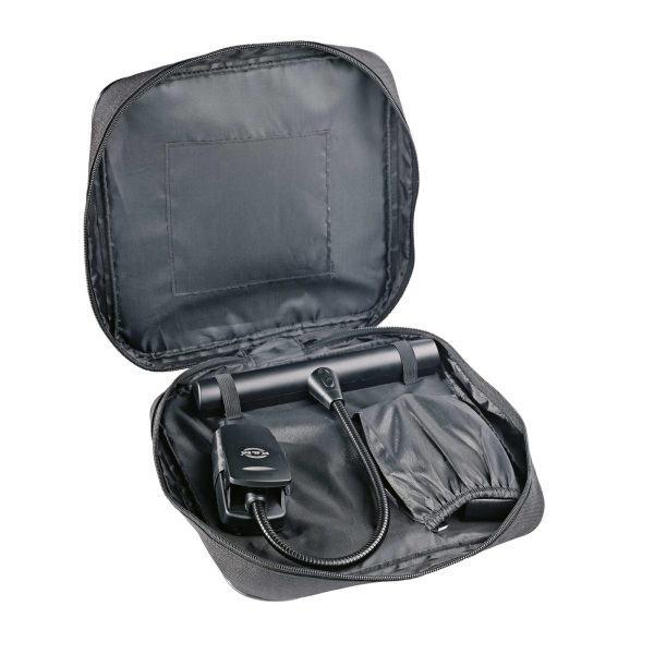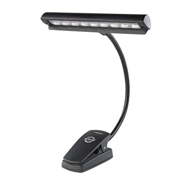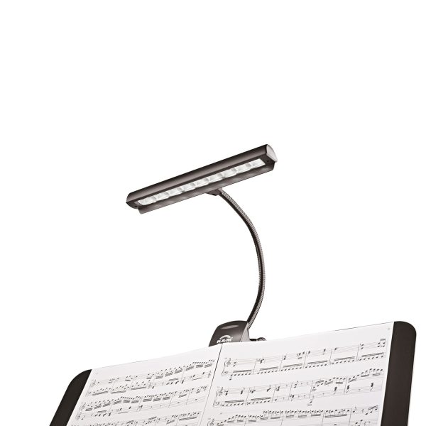 Professional orchestra light with batteries and power supply. Nine extra bright and energy-efficient LEDs provide consistent and vibrant lighting. The flexible gooseneck is fully adjustable. The light has a switch with two brightness levels. The light cone is limited to the music sheet through an anti-glare shield. An extra-strong clip provides a secure grip on music stands. The complete set is comprised of 3 AA 1.5V batteries, a power supply with a 3 m cord, as well as a durable carrying case.