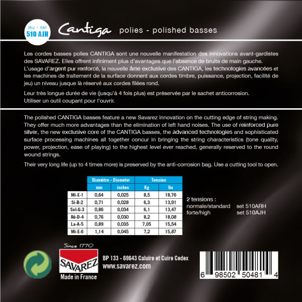 The polished CANTIGA basses feature a new Savarez innovation on the cutting edge of string making. They offer much more advantages than the elimination of left hand noises. The use of reinforced pure silver, the new exclusive core of the CANTIGA basses, the advanced technologies and sophisticated surface processing machines all together concur in bringing the string characteristics (tone quality, power, projection, ease of playing) to the highest level ever reached, generally reserved to the round wound strings.
