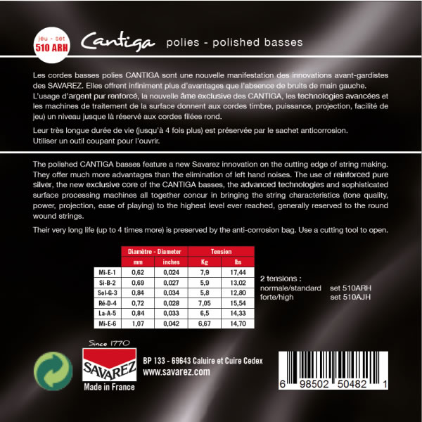 Our knowledges plus the innovations dedicated to the CANTIGA strings lead to the creation of the “polished basses CANTIGA wound with reinforced pure silver”. They are associated to associated to Alliance treble strings.