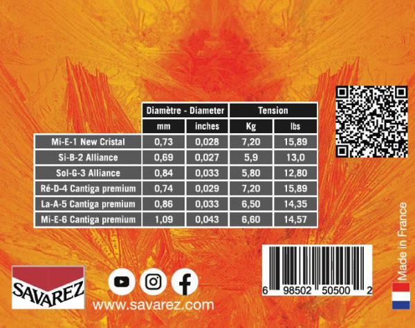 These sets are composed with the strings of the CANTIGA PREMIUM sets; the choice of the mix of treble strings is different to answer the request of the guitarists attached to the ALLIANCE fluorocarbon strings and who appreciate the MI.E1 nylon NEW CRISTAL.