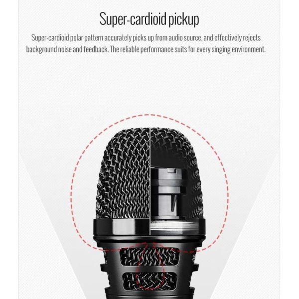 • Super cardioid pickup, pop-noise-resistant design, low feedback and high gain